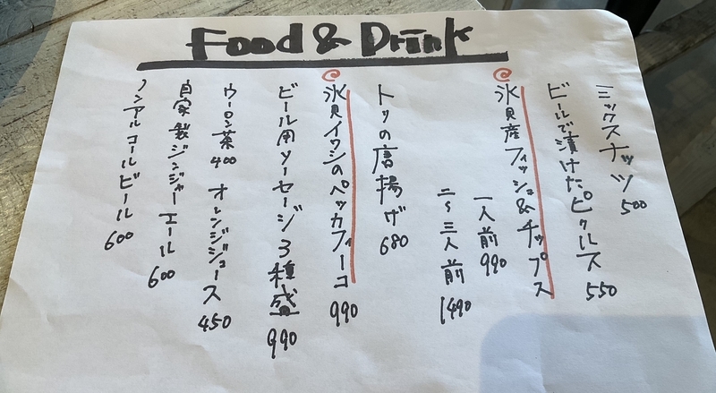 ソフトドリンクとおつまみメニューです。がっつりしたお食事はありませんが、揚げ物などお腹にたまるおつまみもあります。