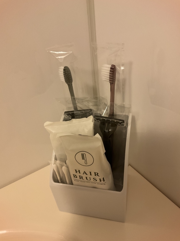 お部屋に歯ブラシ、ヘアブラシ、ボディタオル、カミソリがあります。フロントのアメニティーバーからフェイスマスク、入浴剤、化粧水、乳液、コットンをいただきました。