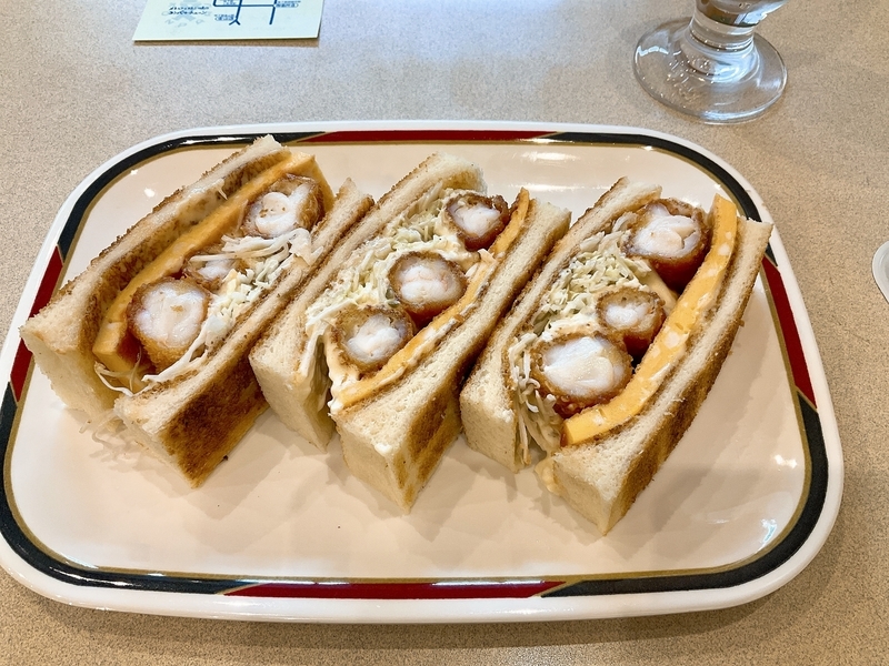 朝チェックアウト後、モーニングに名古屋で有名なコーヒーチェーンのコンパルに行きました。栄店などは朝から行列らしいですが、金山店は待ちなく入れます。お客さんも地元の方が多めでした。レトロな空間です。もちろん名物のエビフライサンドをいただきます。