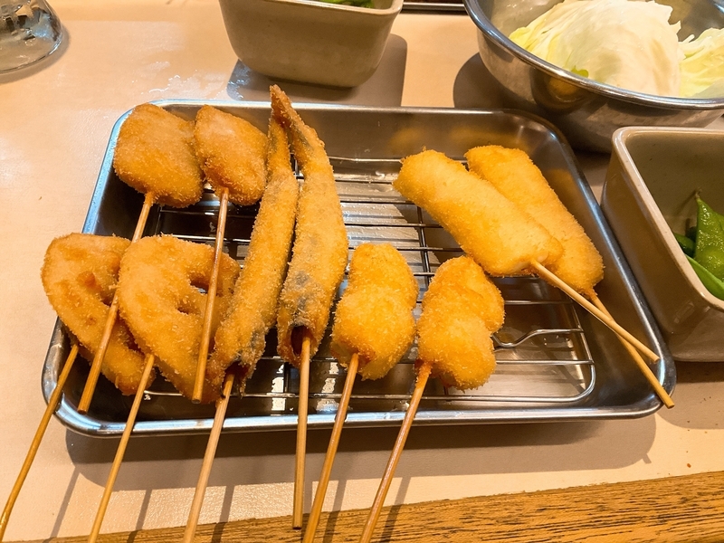 串かつは2回に分けて提供されます。かぼちゃ、もち、つくね、えび、元祖串かつ(牛)、うずら、アスパラです。