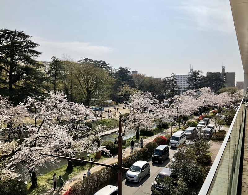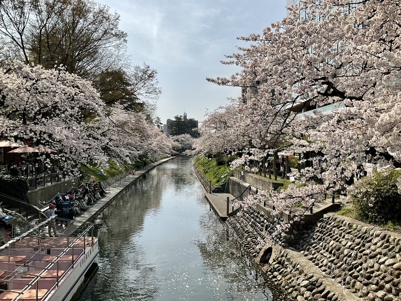 今年も出遅れまして、私が行った日は散り始めでした。しかし、晴れた日の桜吹雪はキラキラしてとってもきれいでした。遊覧船待ちのお客さんもたくさんいらっしゃいました。