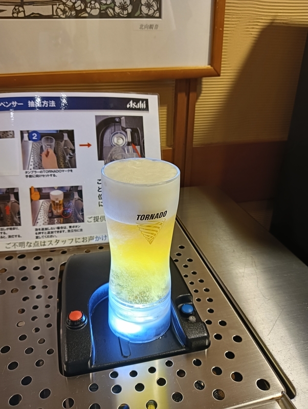 トルネードビールという専用のジョッキを差し込むと下からビールが注がれます。青いボタンを押して泡を足すこともできます。ビールのサービスは到着日の夕食前までです。