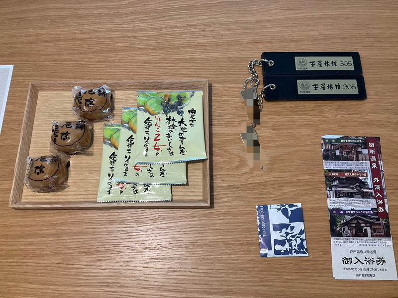 お着き菓子は温泉饅頭とりんご煎餅でした。外湯の無料券もいただけました。鍵は2個もらえます。プレミアムスイートルーム特典で1階ラウンジのワイン用のコインが人数分もらえました。