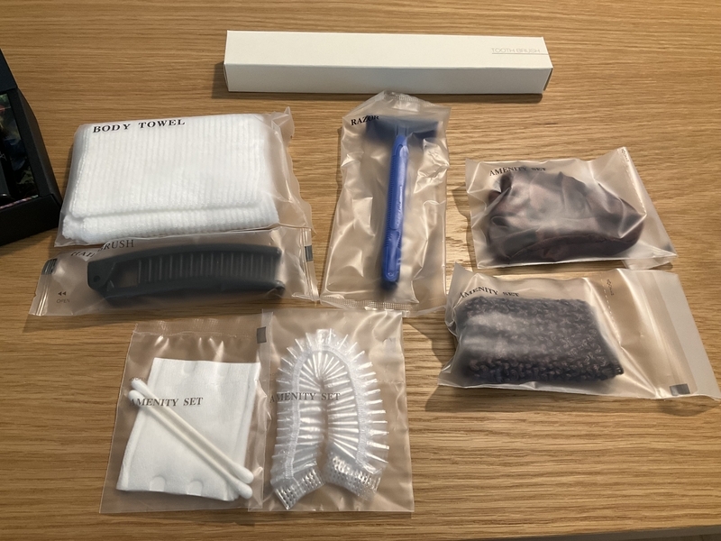 ボトルの化粧水、乳液、ヘアエッセンス、アフターシェーブローション、ヘアトニックに加え、プレミアムスイートルーム特典のスキンケアが女性のみあります。アメニティは歯ブラシ、カミソリ、ボディタオル、ヘアバンド、シュシュ、コットン・綿棒、シャワーキャップ、ヘアブラシと揃っています。