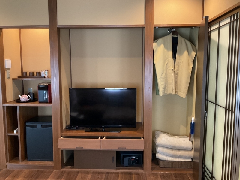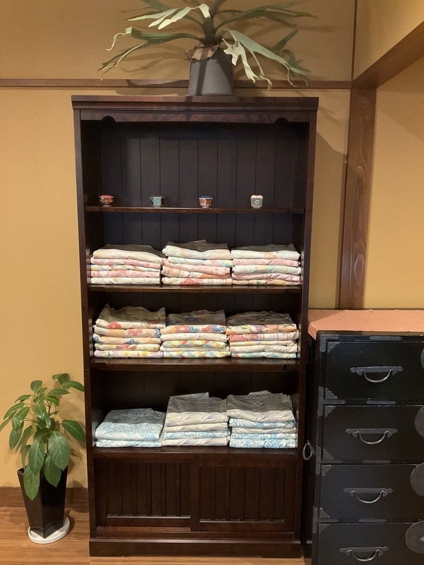 お部屋に案内されるときに、色浴衣か作務衣を選びます。ラクなので作務衣を選びましたが、浴衣もかわいかったです。
