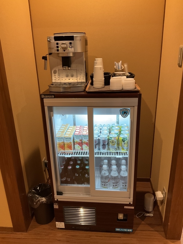 こちらのドリンクは無料でいつでもいただけます。コーヒーマシーンのみ、深夜は使えません。オレンジジュース、リンゴジュース、ビール、レモンチューハイ、コーラ、ジンジャーエール、強炭酸水があります。