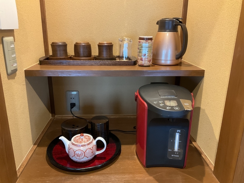 電気ポット、緑茶の用意があります。九谷焼の急須や木のカップもかわいいです。ミックスナッツも無料です。ロビーのビールと一緒にいただけるので、部屋飲みにはぴったりです。高級ホテルでも有料なことが多いので、うれしいですね。
